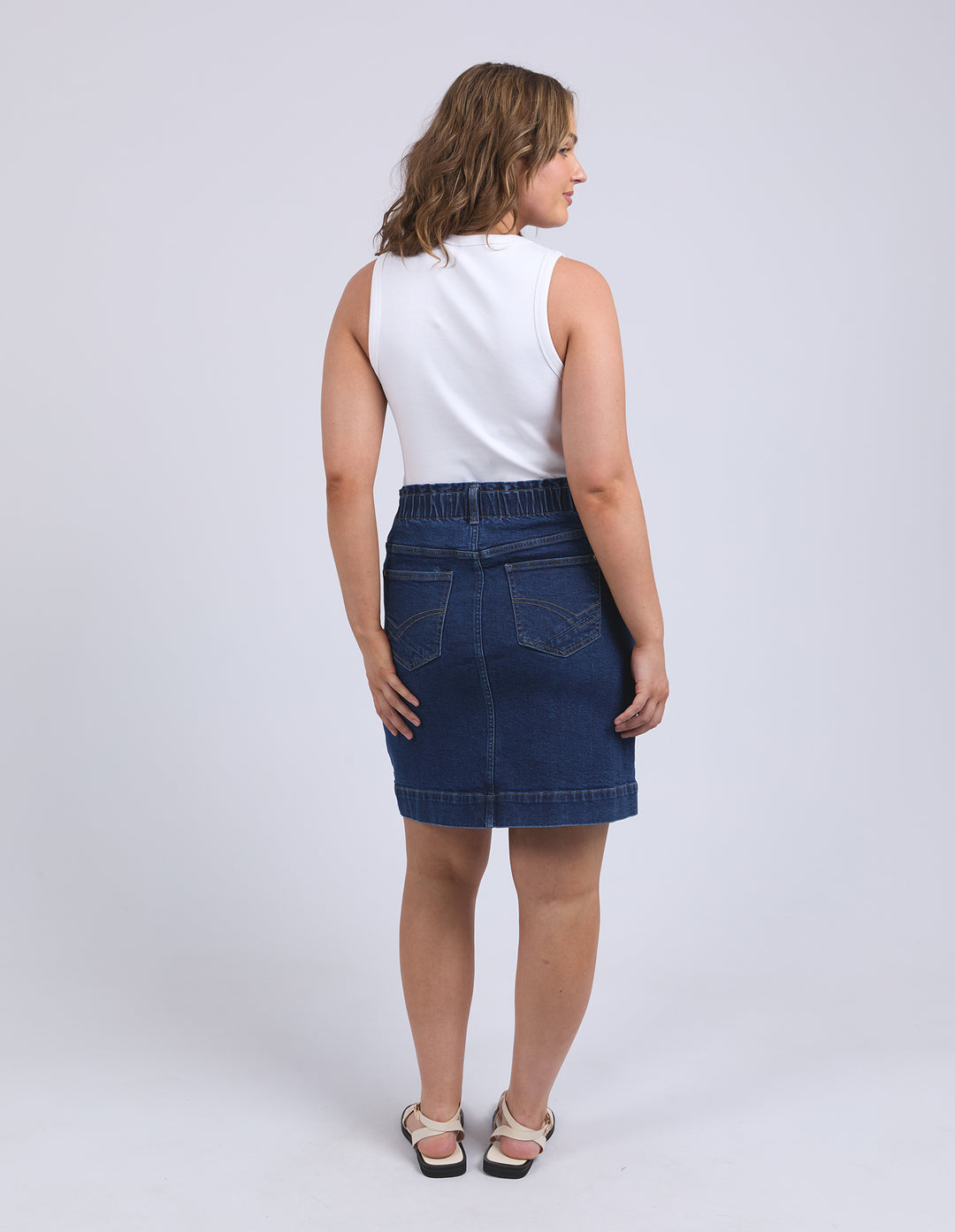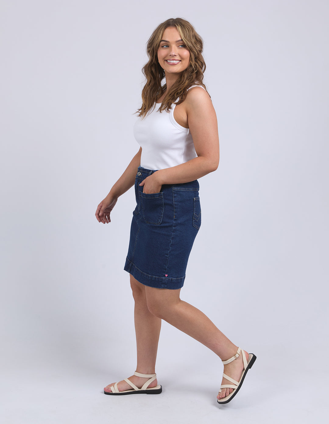 Redefine comfort and chic with the Lennox Denim Skirt, featuring the comfort of an elastic waistband and the style of patch pockets this is an easy wear stylish denim skirt.